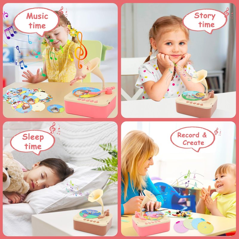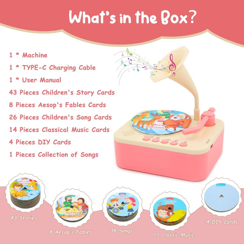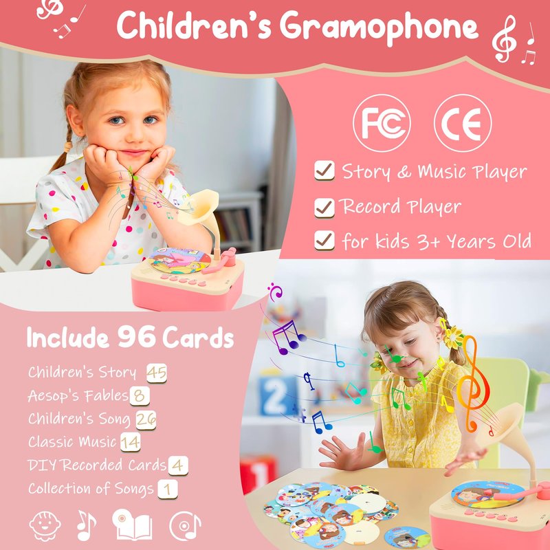 - šInteractive Toddler phonograph with 96 Records: This kids gramophone includes 96 cards featuring stories, aesop's fables, songs and classical music to engage your childās imagination and enhance cognitive, language, and musical skills. It's the perfect early education companion for kids aged 3 and older