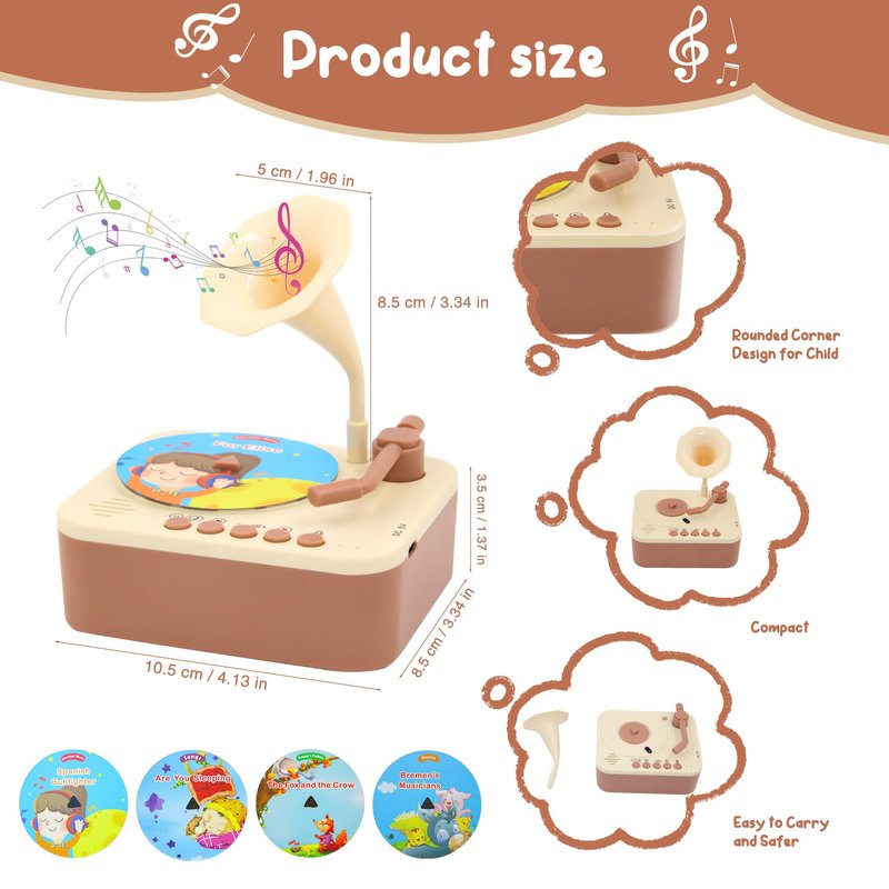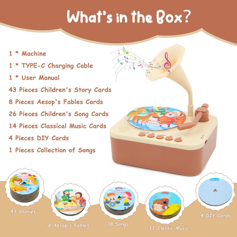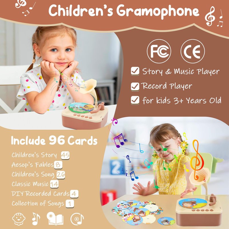 - šInteractive Toddler phonograph with 96 Records: This kids gramophone includes 96 cards featuring stories, aesop's fables, songs and classical music to engage your childās imagination and enhance cognitive, language, and musical skills. It's the perfect early education companion for kids aged 3 and older