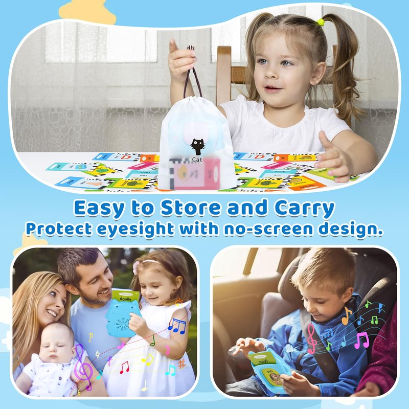 Montessori Learning Toddler Toys - Spanish and English talking flash cards include 112 cards with 224 early educational sight words. It includes 14 themes covering vehicles, animals, foods, vegetables, fruits, persons, jobs, costumes, bodies, actions, colors, shapes, nature and daily necessities. The speech therapy toys adopts the Montessori learning method combined with various animal and vehicle sounds, making learning fun and engaging.