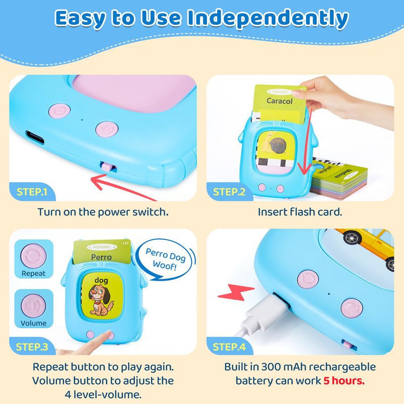 - 【 Easy to Use Independently for Toddlers】- Put the card into card reader’s slot, the pocket speech reader will pronounce the words with a native accent in Español and English. It makes a real animal or vehicle’s sound when an animal card or vehicle card was inserted. Use the repeat button to listen again to enhance kids memory. Size 4.29×3.52×0.78 inches is good for toddlers' small hand holding. Offer a storage bag, portable to carry to classrooms, playrooms, daycare, kindergarten, car, road trips, airplane and outdoors.