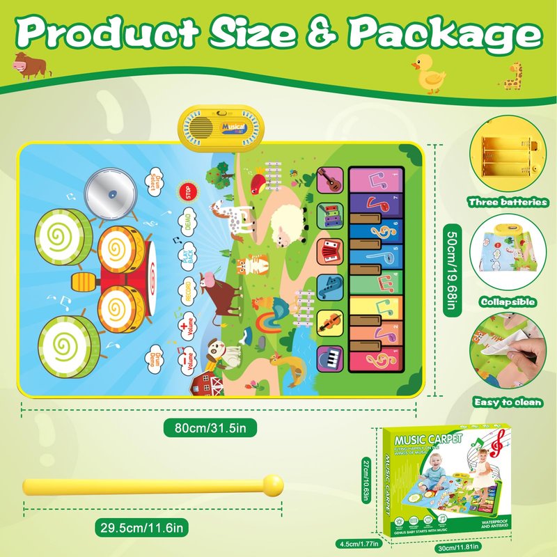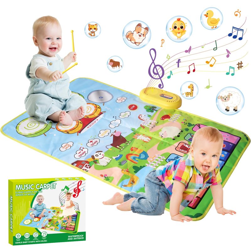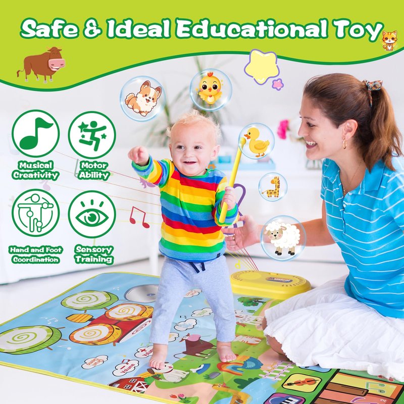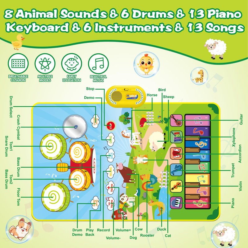 - 【Baby Musical Toys】Our baby musical toys include a 3 in 1 music mat and 2 sticks. This toddler toys has the sounds of 6 instruments (Piano Violin Trumpet Accordion Xylophone Guitar), 13 piano keys, 6 Different Drum and 8 cute animal sounds. Multifunctional baby musical toys help baby learn to play many different styles of music. This baby toys is a great montessori toys for 1 2 3 year old boy.