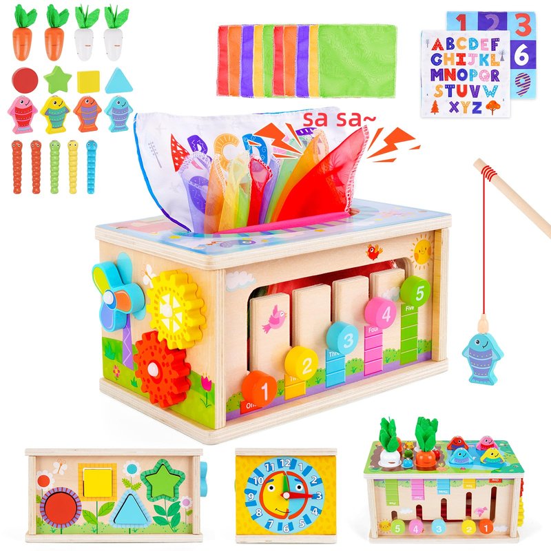 - 【Endless Fun for Little Explorers】1 wooden tissue box with 8 classic play styles: 10 soft cloth tissue, 1 crinkly paper, 5 cute worms, 4 carrots, 4 fishes, 4 shape blocks, and 1 fishing rod. In a montessori toy, delight your baby with 8 engaging play methods! From whimsical tissue box play to interactive number clock, spinning gears & windmill, shape sorters, magnetic fishing and farm carrots fun, and captivating number maze, each element promises hours of laughter and discovery for your baby.