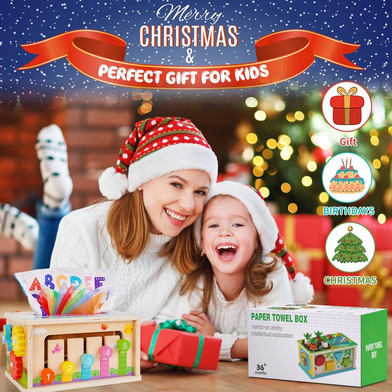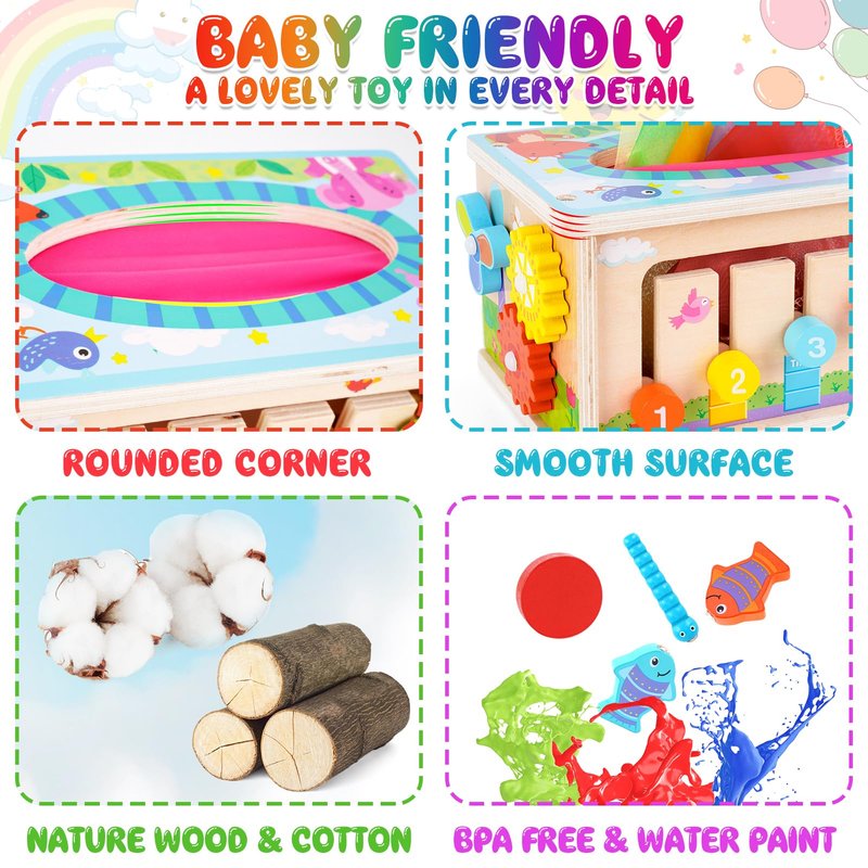 - 【Educational Toys for 3 Year Old and Fun Baby Gift】All accessories can be stored in this toy tissue box, easy to be a outdoor toys. This infant toys features bright colors and tactile design, making it as the ideal preschool toy to promote learning and development through play. It is an ideal gifts for Children's Day, Birthday gifts, Christmas gifts, New Year gifts, and more. It's the ideal gifts for 3 year old boys girls: this wooden baby toys keeps on giving and nurturing young minds.
