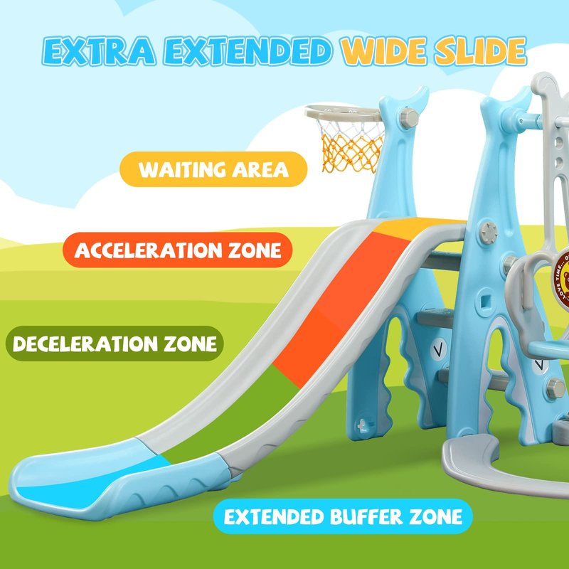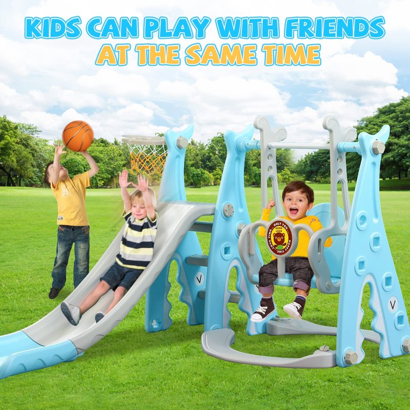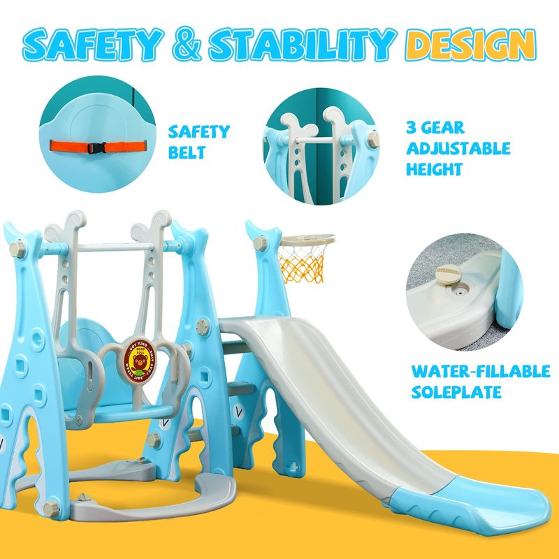 - 【Multi-functional Kids Playset】 The 4-in-1 playing set offers 4 games: a smooth slide, a non-slip climber, a sturdy swing and a basketball hoop, which is intended for family and domestic outdoor use. All activity elements are appropriately sized for toddlers 3+ years old.