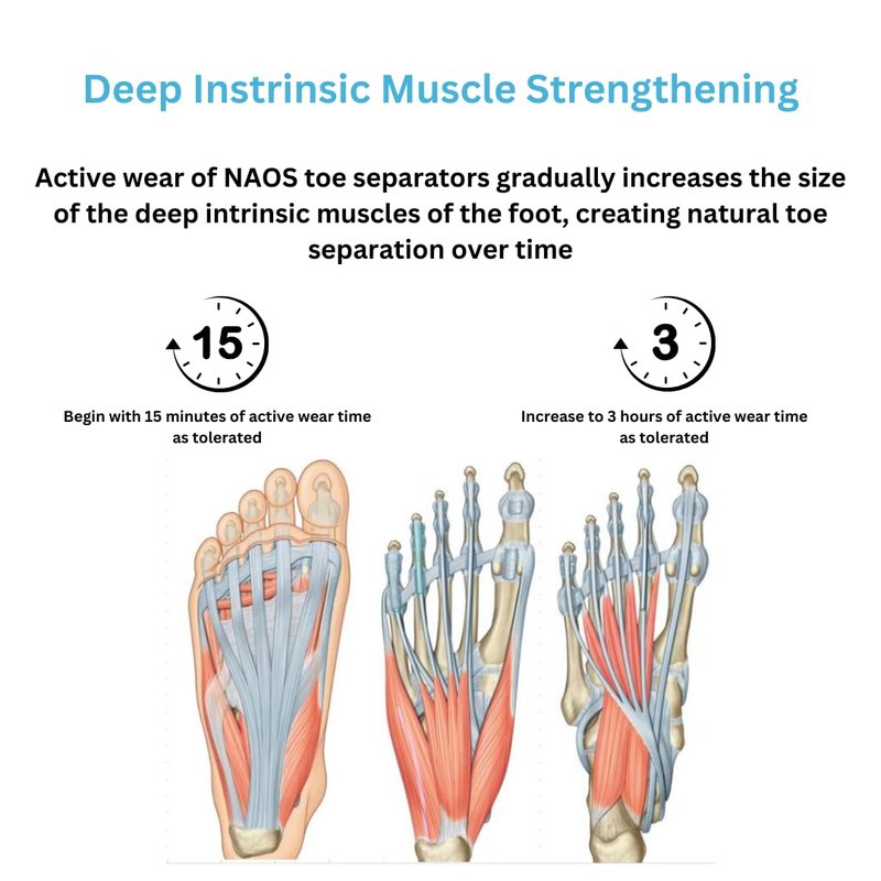 - Gradual Strengthening: Our gel toe separators offer the perfect density to improve muscle strength and increase the size of the deep instrinics of the foot. Begin with 15 minutes of active wear time, and increase to 2-3 hours per day as tolerated.