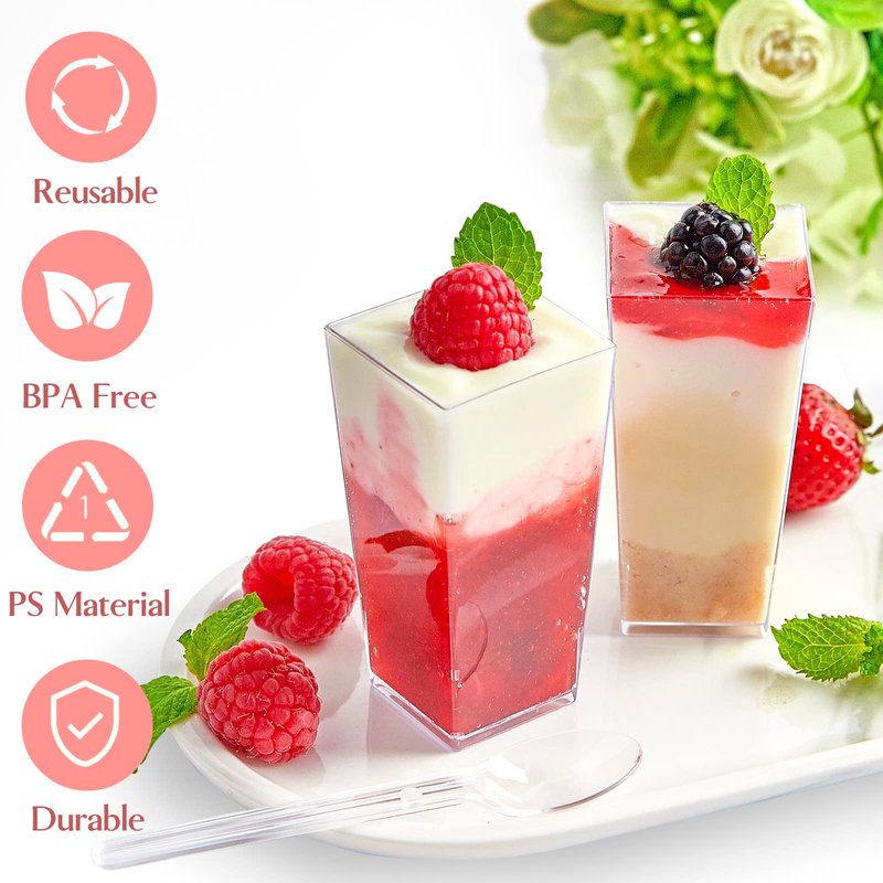 - Pack of 100 : The package includes 50pcs plastic dessert cups and 50pcs plastic spoons, great catering supplies for home or restaurant us