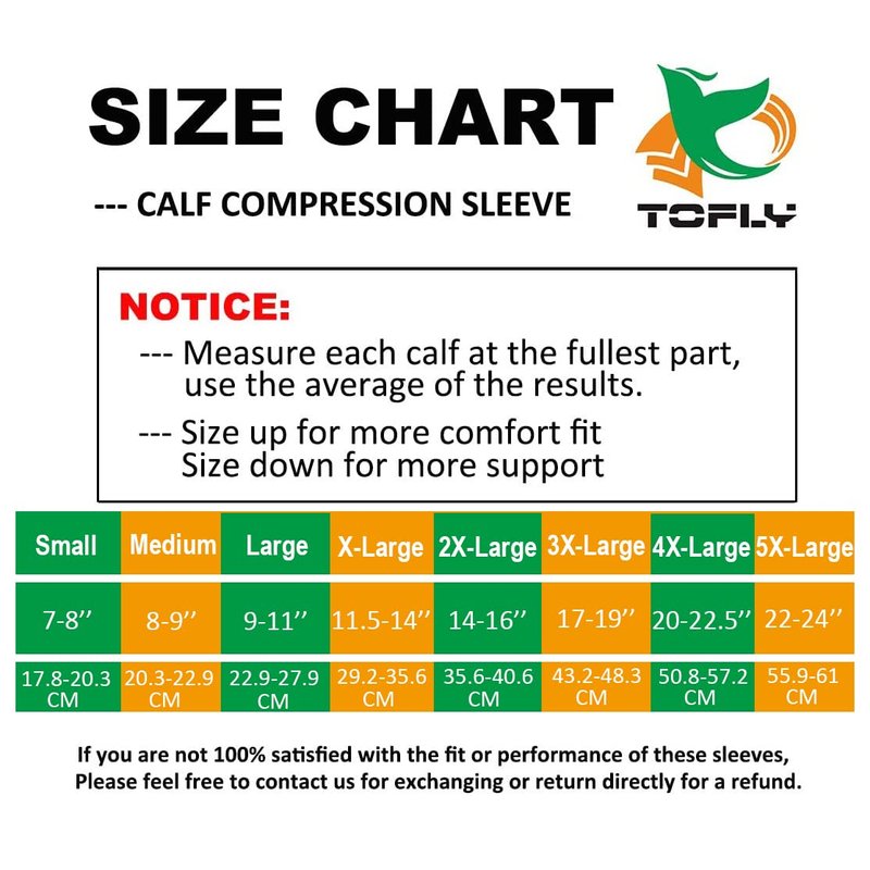 - ★★★ 【GET PERFECT FIT ACCORDING TO SIZE CHART】Measure the thickest part of your calf then compare to the size chart of left images to get perfect fit. The sizes include Small, Medium, Large, X-Large, 2X-Large, 3X-Large, 4X-Large, 5X-Large and carefully measured to ensure an exact fit. So , whether you already have other calf sleeves, please try ours this time, as we provide "BUY 100% RISK FREE" Service, so why not to see whether these are better for you?