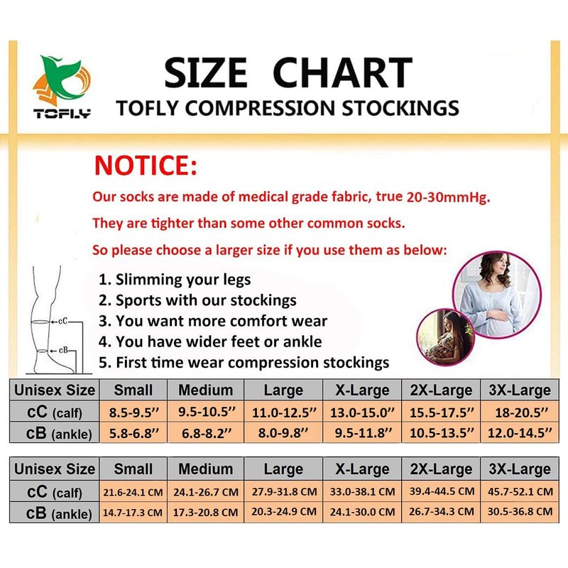- IT JUST WORKS! -【DURABLE & COMFORTABLE】- TOFLY knee high compression socks are made of premium quality medical grade , lightweight, breathable & long-lasting, sweat-absorbent, anti-slip materia. Graduated compression of 15-20mmHg, with a seamless woven manufacturing, these fit comfortably without lossing compression even after wearing for long time . If conditions allow, we strongly recommended purchasing 2 pairs for the same product to replace them, as this will double its life for each pair.