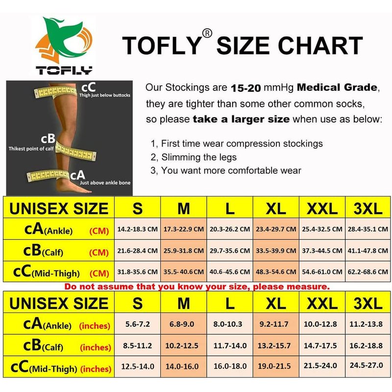 TOFLY Thigh high Compression Socks are 1280D GRADE which means they will fit tightly with a graduated compression of about 15-20mmHg. DO NOT expect these to fit like regular socks. They need to fit tightly in order to work their magic! Check the size chart included in our listing images for reference. If your measurements are between sizes, go for a bigger size. Maternity Compression Stockings are the ideal companion for mothers before, during, and after pregnancy. True Gradient High-Grade Compression: Eliminate swelling in ankles, feet, and toes caused by water retention and poor circulation. Improve circulation to prevent accumulation of blood in the legs (the leading cause of varicose veins). Maternity Socks accelerate blood flow to the heart, delivering more oxygen and nutrients for you AND your new baby via the bloodstream. Top band lined with silicone dots for increased grip to ensure stocking remains in place throughout the day without constricting the leg. Suitable for people who often stand or maintain a long posture time. Sound sleep at night: The stockings can help prevent & reduce lower leg cramps, which is often common during pregnancy. Slimming! Stovepipe! Make your thigh looks thin and keeps thin. How to Use the Compression Stockings: 1. Use your fingertips or palm to “slide” the stocking up your leg. 2. Do not pull from the top of the stocking because that may rip the stocking. 3. Continue to slide the stocking up your leg until it is positioned correctly. Repeat these steps on the other leg. Since we know the Compression Stockings WORKS! 20-30 medical compression stockings thigh high compression hose for women men thigh high compression socks women 20-30 mmhg open toe support socks for women compression 20-30 Thigh high leg sleeves Thigh High Compression Sleeves over the knee compression socks for women medias de compresion para varices medias de compresion para mujer compression socks for women 20-30 mmhg knee high