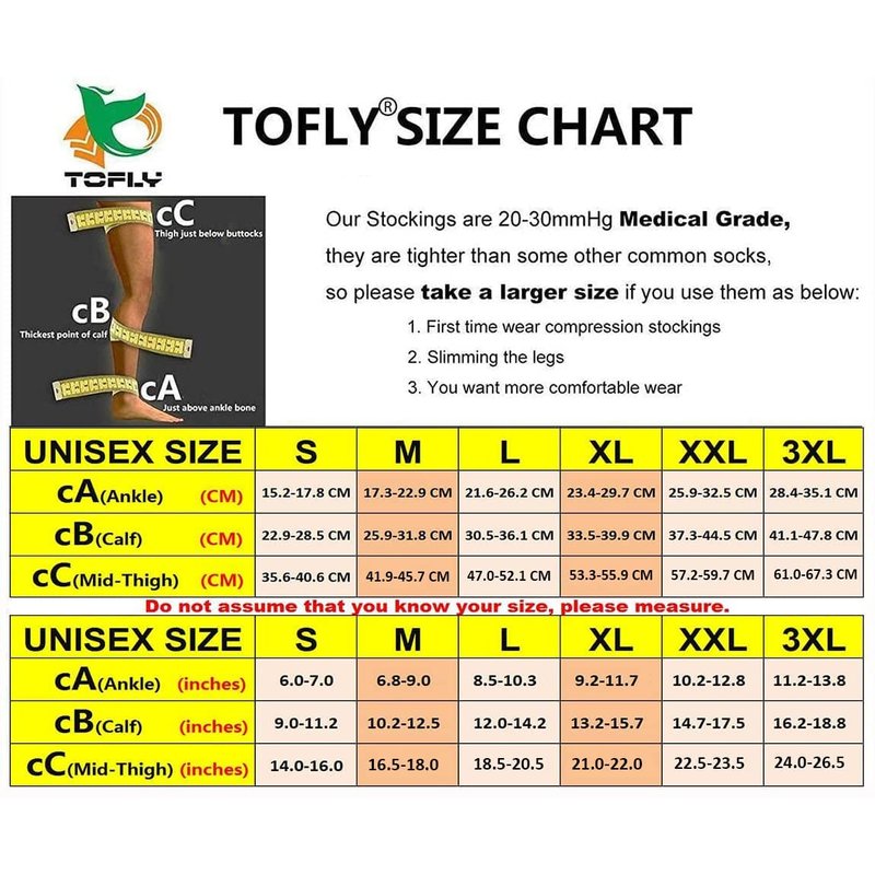 TOFLY Thigh high Compression Socks are 1280D GRADE which means they will fit tightly with a graduated compression of about 20-30mmHg. DO NOT expect these to fit like regular socks. They need to fit tightly in order to work their magic! Check the size chart included in our listing images for reference. If your measurements are between sizes, go for a bigger size. Maternity Compression Stockings are the ideal companion for mothers before, during, and after pregnancy. ✅ True Gradient High-Grade Compression: Eliminate swelling in ankles, feet, and toes caused by water retention and poor circulation. Improve circulation to prevent accumulation of blood in the legs (the leading cause of varicose veins). ✅ Maternity Socks accelerate blood flow to the heart, delivering more oxygen and nutrients for you AND your new baby via the bloodstream. ✅ Top band lined with silicone dots for increased grip to ensure stocking remains in place throughout the day without constricting the leg. ✅ Suitable for people who often stand or maintain a long posture time. ✅ Sound sleep at night: The stockings can help prevent & reduce lower leg cramps, which is often common during pregnancy. ✅ Slimming! Stovepipe! Make your thigh looks thin and keeps thin. How to Use the Compression Stockings: 1. Use your fingertips or palm to “slide” the stocking up your leg. 2. Do not pull from the top of the stocking because that may rip the stocking. 3. Continue to slide the stocking up your leg until it is positioned correctly. Repeat these steps on the other leg. Since we know the Compression Stockings WORKS!20-30 medical compression stockings thigh high compression hose for women men thigh high compression socks women 20-30 mmhg open toe support socks for women compression 20-30 Thigh high leg sleeves Thigh High Compression Sleeves over the knee compression socks for women medias de compresion para varices medias de compresion para mujer compression socks for women 20-30 mmhg knee high