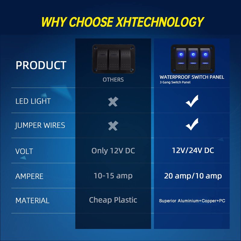 - [Waterproof Switches & Aluminum Panel]: The item is made of waterproof switches and aluminum panel, which is sturdier and more durable than plastic panel. The item has a unique technology in the waterproof structure. The ultra-thin silicone film prevents water from entering the inside of the switch panel, ensuring the inner cavity is dry, avoiding short circuits, and making the boat rocker switches safer during use.