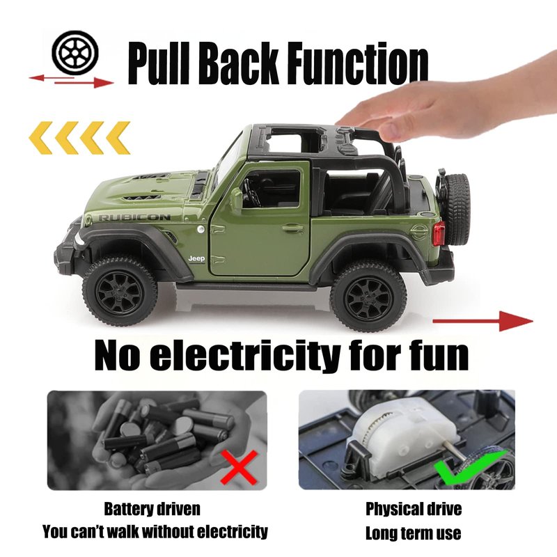 - High-Quality Materials:The JEEP die-cast car is made of zinc alloy,plastic parts and rubber tires,making it safe for children to play with.It features detailed interior and exterior trim, and is very sturdy.