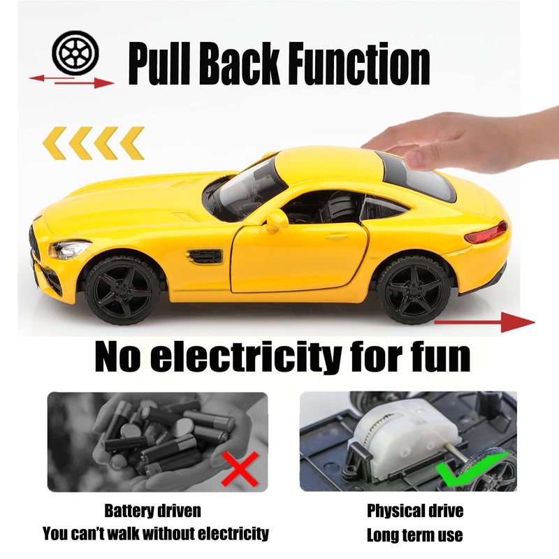 - Function:No batteries are required, but the vehicle has a powerful pull back feature. Simply pull it back, then release your hand, and the car will go for a long distance. The doors may be opened to view the whole inside of the vehicle. So appealing to children and collectors alike.