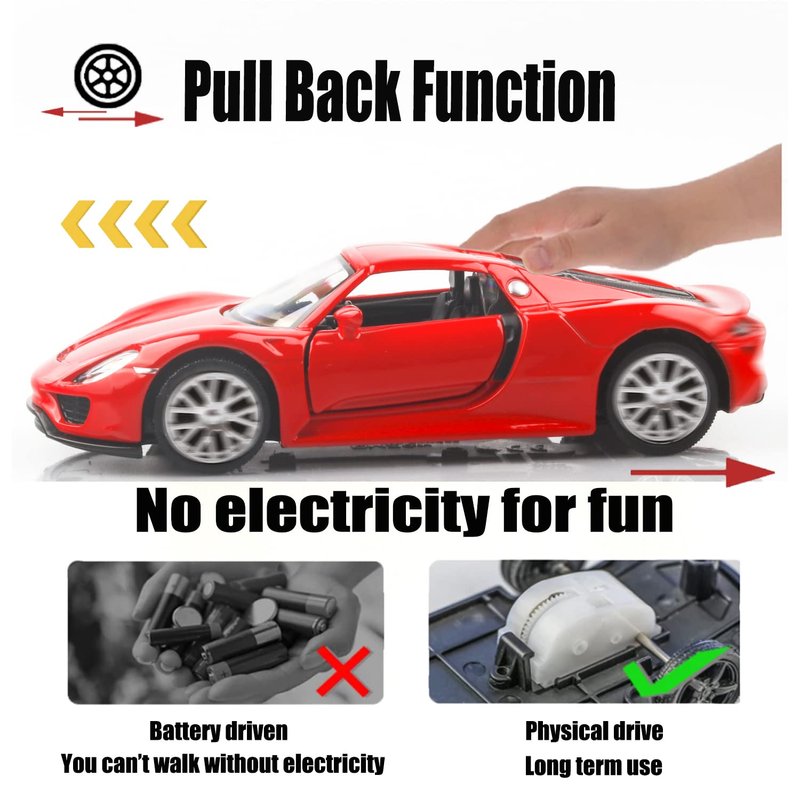 TOKAXI Die-cast Porsche 918 Spyde model cars are made of high-quality alloy materials and are miniature replicas of real cars. These car toys are small enough for kids' hands to handle, made cutely and easy to control. They're very handy to carry wherever you go. This car doesn't require batteries- just pull it back and watch it go! This is a great way to help children exercise their hand-eye coordination and reaction speed. The car door is designed to open separately, making it easy for children to learn about cars. The realistic interior decoration is also enjoyable and educational. You can use it as an ornament in your home or put it on your car to show your appreciation for art. This pull-back car is not just a toy for kids but also a nice addition to enthusiasts' car model collection. We have a wide selection of cars to choose from, so you can find the perfect one for your collection from our products. All of TOKAXI die-cast model cars are attractively packaged in English, making them the perfect Christmas, Birthday, Children's Day, New Year gift for kids, party favors, home decorations, or travel toys for boys and girls.