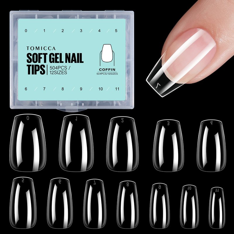 TOMICCA Coffin Nail Tips - 504Pcs Clear Acrylic Nails, 12 Sizes Short Soft Gel Nail Tips, Pre-shaped False Fake Nails Kit for Nail Extension, Full Cover Press on Nails for DIY Nail Salon
