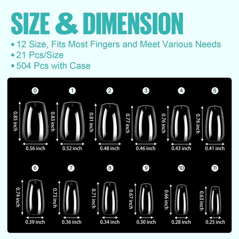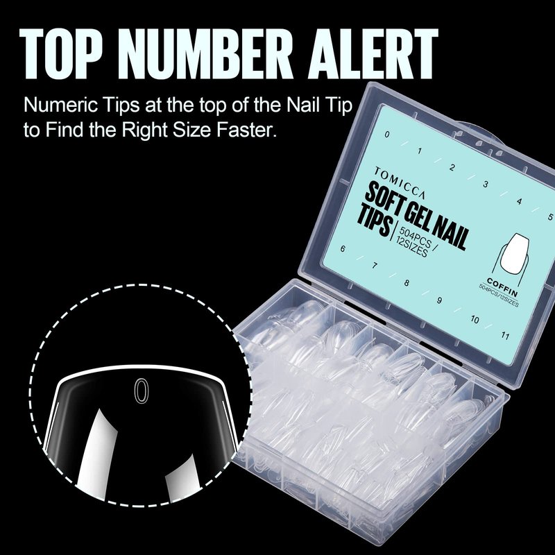 - MULTIPLE SIZES AND NAIL TYPES: TOMICCA offers 504Pcs of artificial nail tips in 12 different sizes. Suitable for most finger needs. Each false nail tip is individually numbered, so you're sure to find a full nail tips that fits your natural nails.