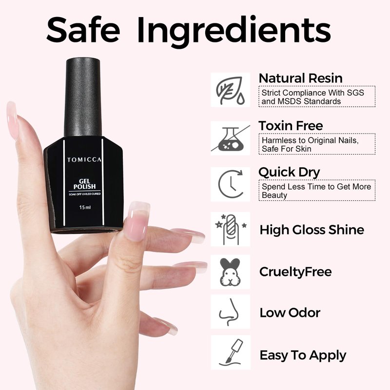 - 【Natural Vegan】:Our translucent pink gel polish is made the latest technology, compliance with SGS standards and contains no harmful ingredients. Which makes it safer for your nail beds, even for pregnant women. Its color depth depends on your nail base color and the number of layers you apply, the fewer layers the more sheer and the more layers the more vibrant. TOMICCA will maintain lasting and professional service for you