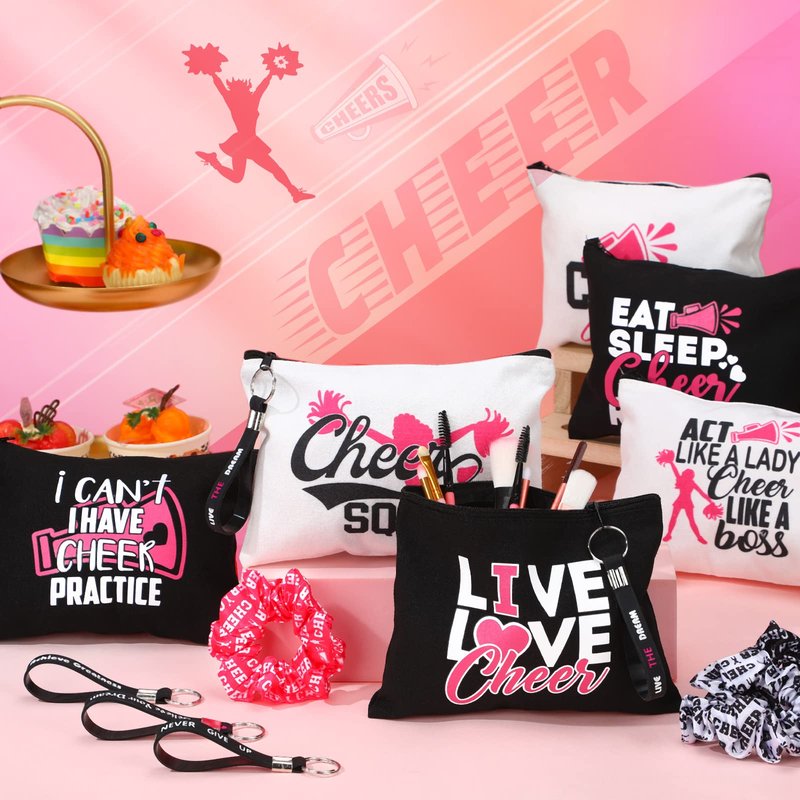Tondiamo 18 Pcs Cheerleading Makeup Bags Cheer Bags Cases Zipper Pouch Cheerleading Quote Keychain Inspirational Key Ring Cheer Scrunchies Girls Elastic Hair Accessories for Cheerleader Teammate Gift