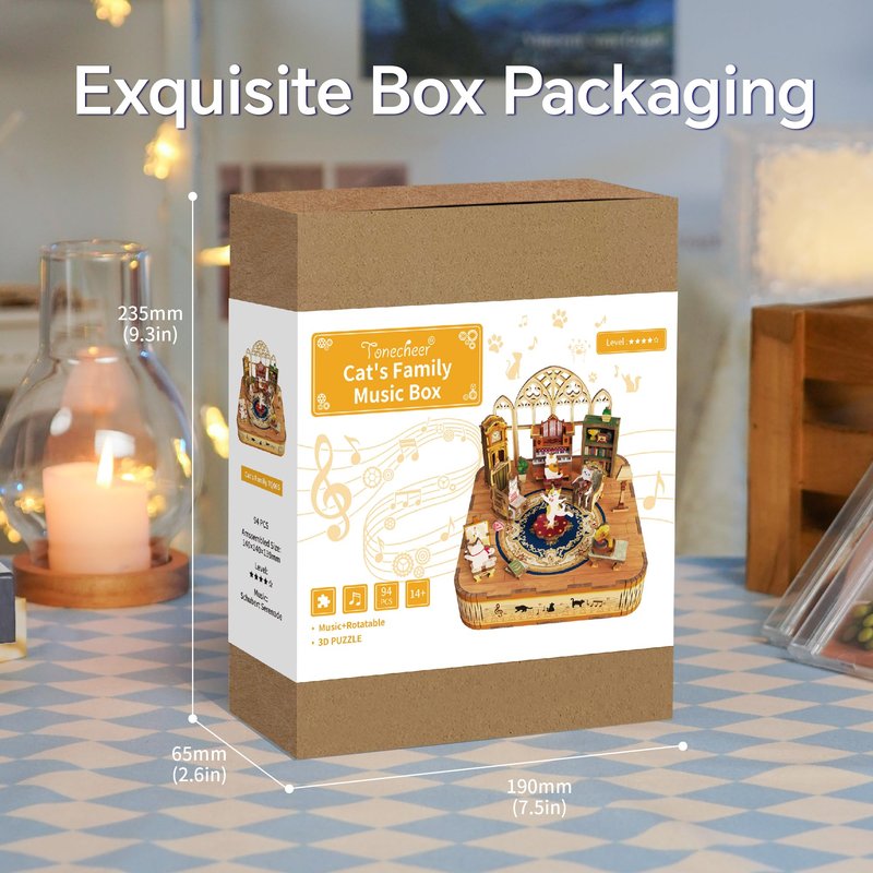 - 【WOODEN MUSIC BOX】The exquisite 3D wooden puzzle kit is different from traditional music boxes, featuring both elegant music and fun 3D puzzles. After the puzzle is completed, turn the clockwork at the bottom and the music will play, while the dancing cat will rotate with the music.The new and cute design is very popular with kids.