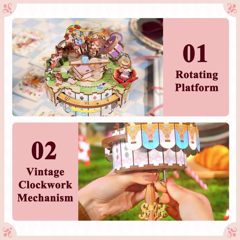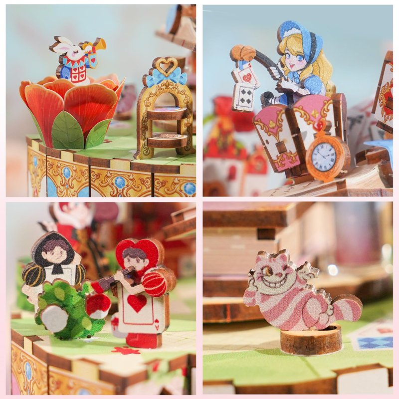 - Wooden Music Box: The exquisite 3D wooden puzzle kit is different from traditional music boxes, featuring both elegant music and fun 3D puzzles. Turning the clockwork, Alice in the teacup begins to spin to the music, and the Cheshire Cat circling around her.