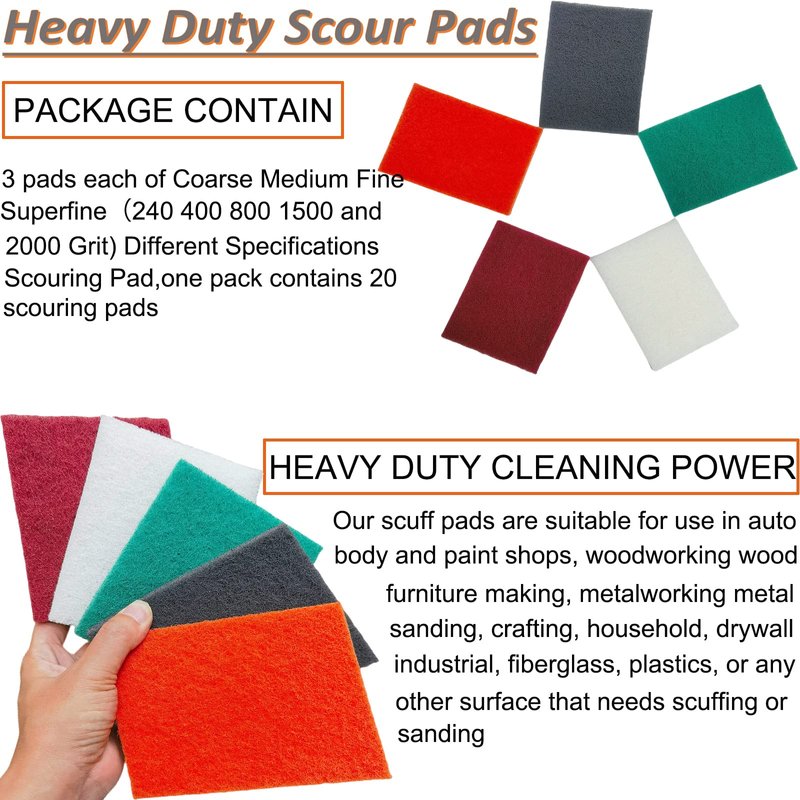 - The Scouring Pad great for cleaning pots, pans, sinks, bathrooms and competent in scrubbing stove burners, broilers, grills and garden tools,and also suitable for use in auto body and paint shops, woodworking wood furniture making, metalworking metal sanding, crafting, household, drywall, industrial, fiberglass, plastics, or any other surface that needs scuffing or sanding.