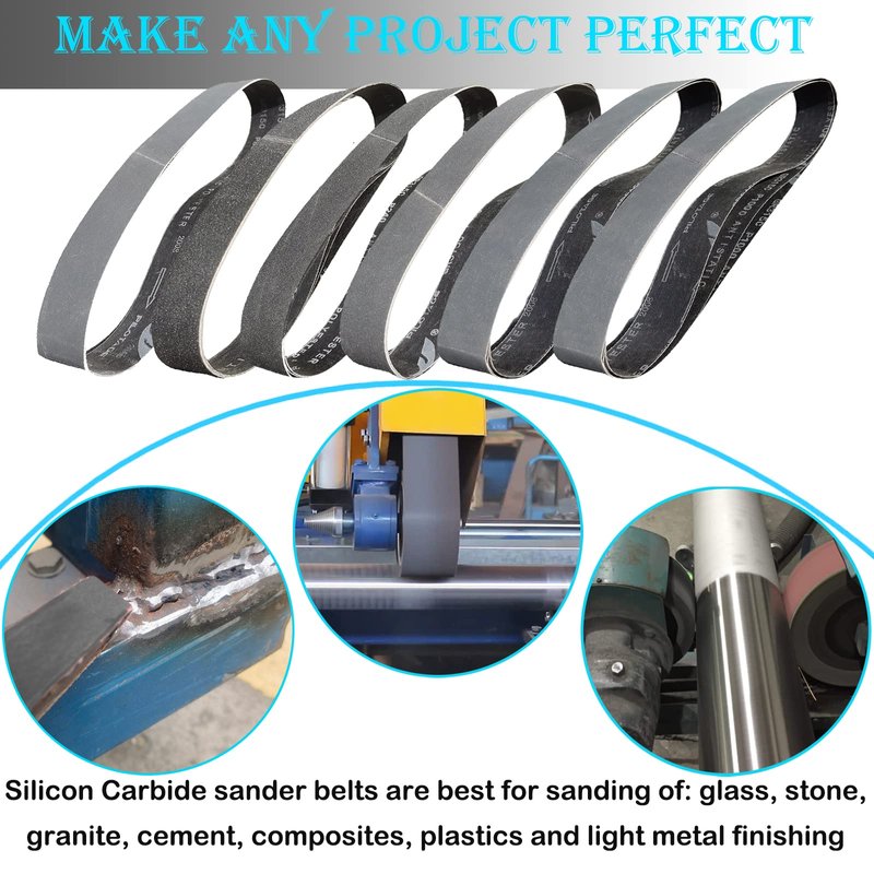 - Silicon Carbide sander belts are best for sanding of: glass, stone, granite, cement, composites, plastics and light metal finishing.