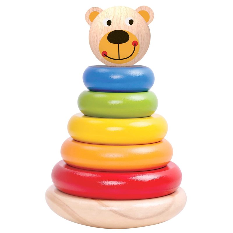 - Includes wobbling stacker, 5 Colorful wooden rings and the bear's head. For toddlers 12 months and older