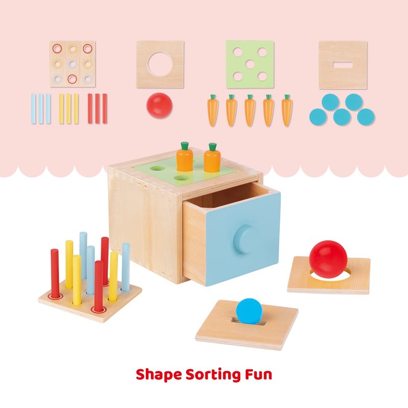 - Includes 1 sorter, 1 drawer, 4 lids, and 20 pieces (carrots, coins, ball, cylinders); Made of wood; For children 12 months and older