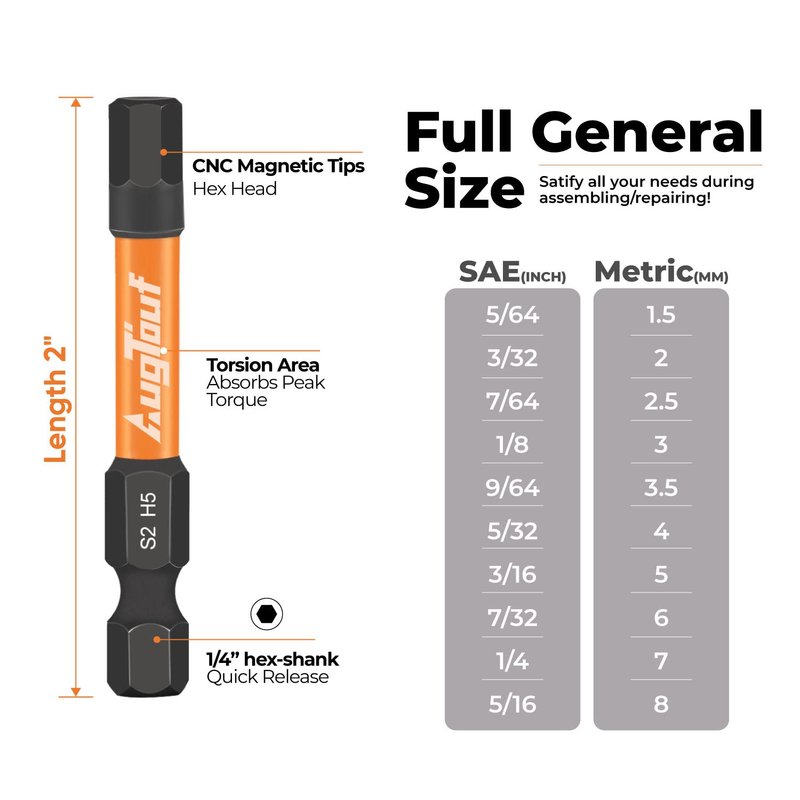 - 10pcs metric hex bits set-1.5mm, 2mm, 2.5mm, 3mm, 3.5mm, 4mm, 5mm, 6mm, 7mm, 8mm. 1/4” quick release hex-shank, 2” long.