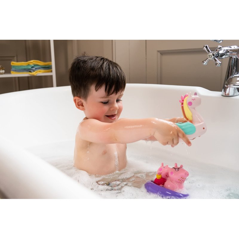 - Peppa Pig Water Toys: Have hours of fun with Peppa Pig, Daddy Pig, Mummy Pig, George and unicorn baby bath toy set. Squirt water to spin the unicorn's water wheel mane or use its float to pour water
