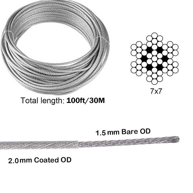 - 【1/16 Stainless Steel Cable Coated】-- 1/16 Vinyl Coated Tension Wire made of 304 stainless steel,cable bare OD is 1.5mm,Coated OD is 2mm; 7x7 core construction consisting of 7 groups of 7 strands braided together making it stronger use for indoor outdoor, offer corrosion resistance, durability and strength rather than galvanized wire,provide longer service life on project.