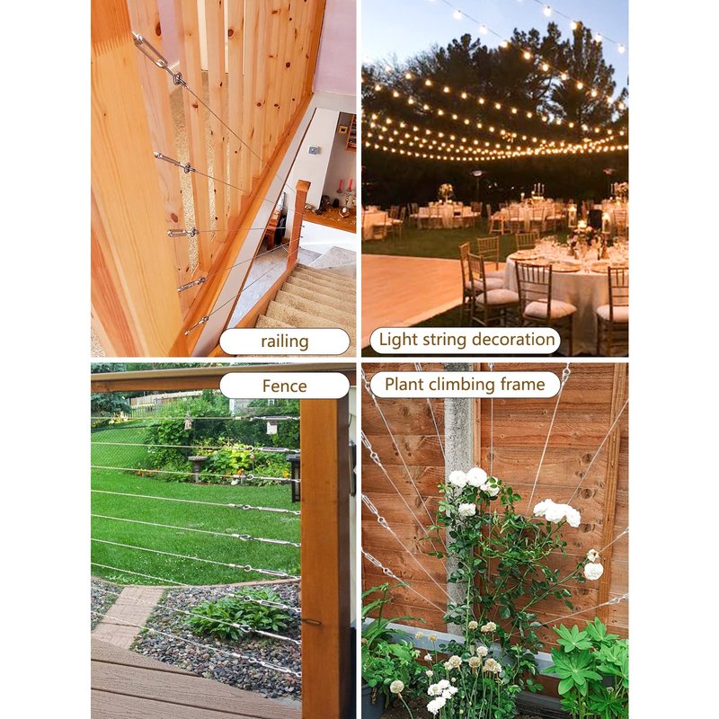 - 【Multipurpose Turnbuckle Kit】: 1/16 Stainless Steel Cable Turnbuckle Kit can get a wide range of light hanging tasks done and allow more flexibility in use including strings light hanging kit outdoor,garden wire kit for climbing plants,wire trellis kit ,espalier wire kit,guy wire kit,wire curtain hanging system,tension wire for chain link fence,cable railing kit,indoor stairs railing, clothesline wire,gate wire tension kit,anti sag gate kit,fence tension wire,catenary wire kit,etc...