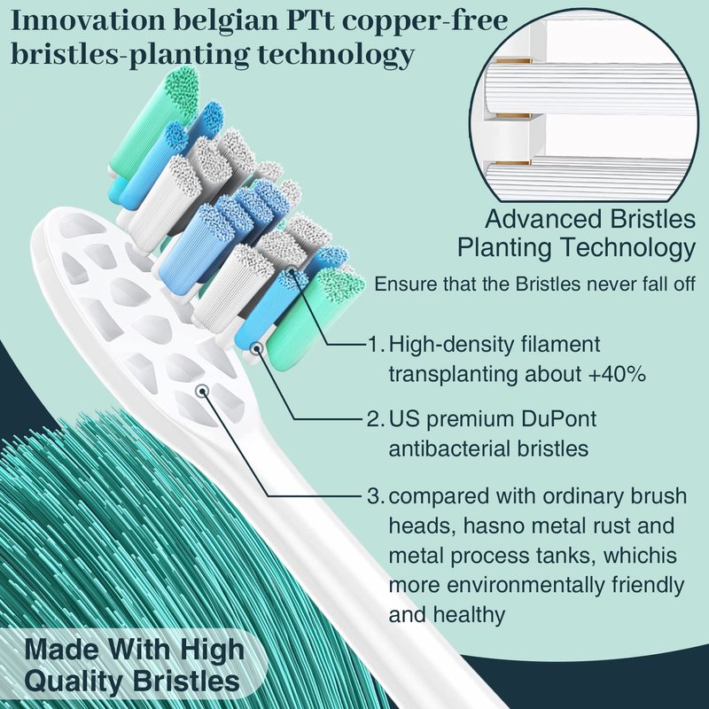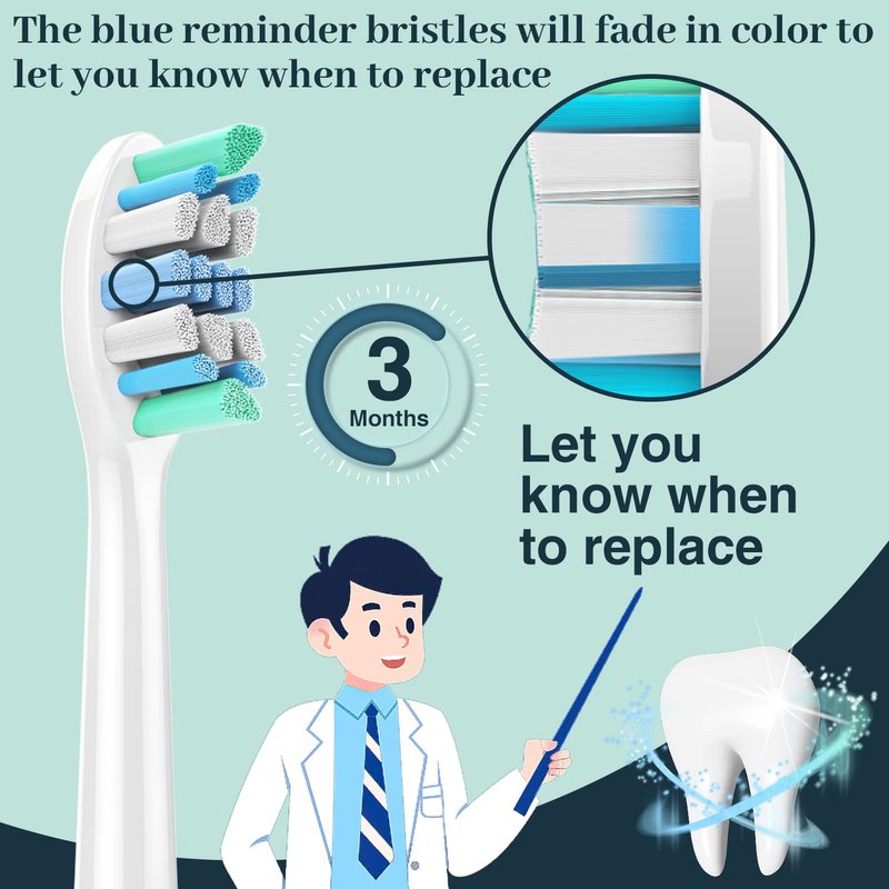 - 【Reminder Bristles - On-time Replacement】Our replacement toothbrush heads are equipped with blue indicating bristles, Brush heads become less effective after 3 months of use, but we'll remind you before this happens. Just monitor your blue replacement indicator bristles, the Indicator bristles will fade in color to remind you it’s time to replacement your toothbrush heads, ensuring your most effective clean.
