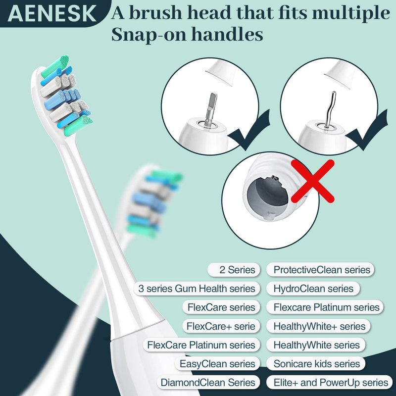 - 【Wide Compatibility - Easy Installation】Compatible with philips sonicare snap-on electric toothbrush Heads. AENESK toothbrush replacement heads are specially designed and perfectly compatible with Philips Sonicare 2 Series Plaque Control, 3 Series Gum Health,DiamondClean, DailyClean, HealthyWhite, FlexCare, EasyClean PowerUp, ProtectiveClean, Click-on Electric toothbrush Handles.