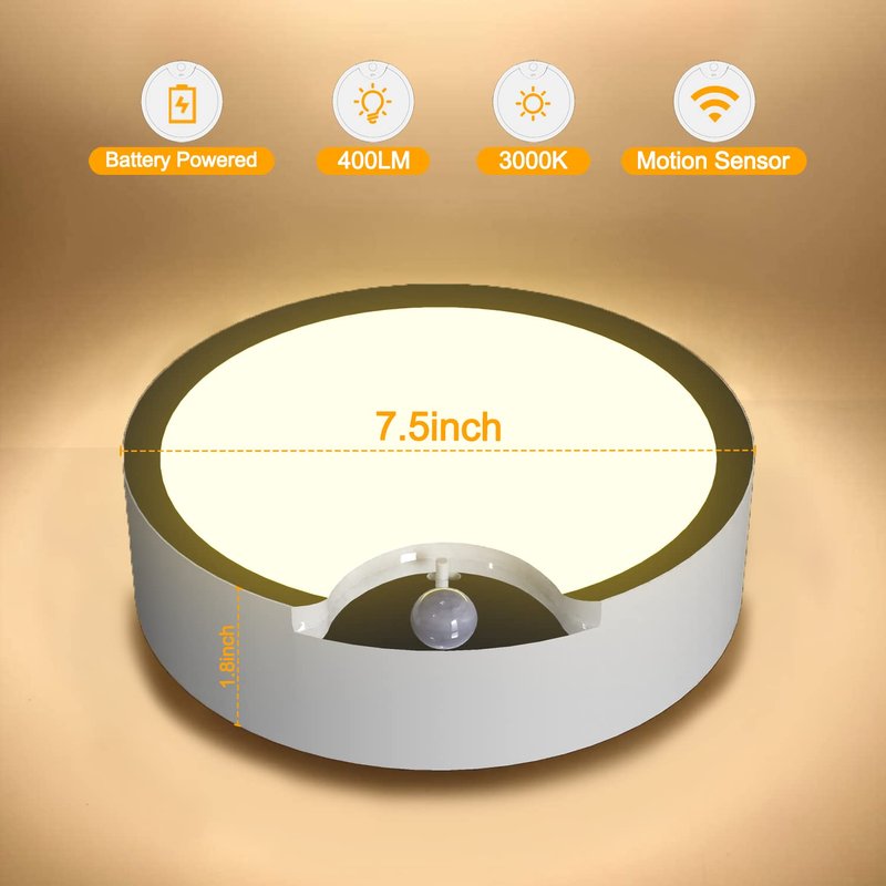 Product description TOOWELL Wireless Motion Sensor LED Ceiling Light provides instant safety and convenience around the home 300 LUMENS - Super bright, effective modern lighting solution. Built-in light sensor & infrared motion sensor. Automatically turn on when motion is detected from up to 19 feet away Upgrade Daylight/Nightlight Mode Forget the experience of motion sensor light doesn't turn on because being affected by sufficient light environment. Upgrade Daylight /Nightlight Mode, you can switch to convenient variety house illumination. Specification 1.Sensitivity: Around 5-8 Meter Distance 2. Sensor Range: About 120 Degrees 3. LED Qty: 80 LED 4. Light Color: White 5. Delay Time: 20S 6. LED Life: 50,000 Hours 7. Size: 7.5 x 7.5 x 2.4 inches 8. Material: ABS 9. Weight: 0.9 pounds 10. Battery Required: 4 D-Cell Batteries (not included) Installation instructions: 1. Twist the back plate of the light counter clockwise to open 2. Easily lift the fixing plug on the back cover, and twist the back cover of the light counter clockwise to open 3. Use the included mounting hardware to install the back plate on a wall, ceiling or anywhere you want 4. Insert batteries into the battery container of the light 5.Turn the light body clockwise to fasten it with back cover tightly Package Contents 1 x Motion Sensor Ceiling Light 1 x User Manual Caution : Only use batteries of the same type, don't mix alkaline , standard ( carbon-zinc),or rechargeable (nickel-cadmium)batteries Do not mix old and new batteries Product information