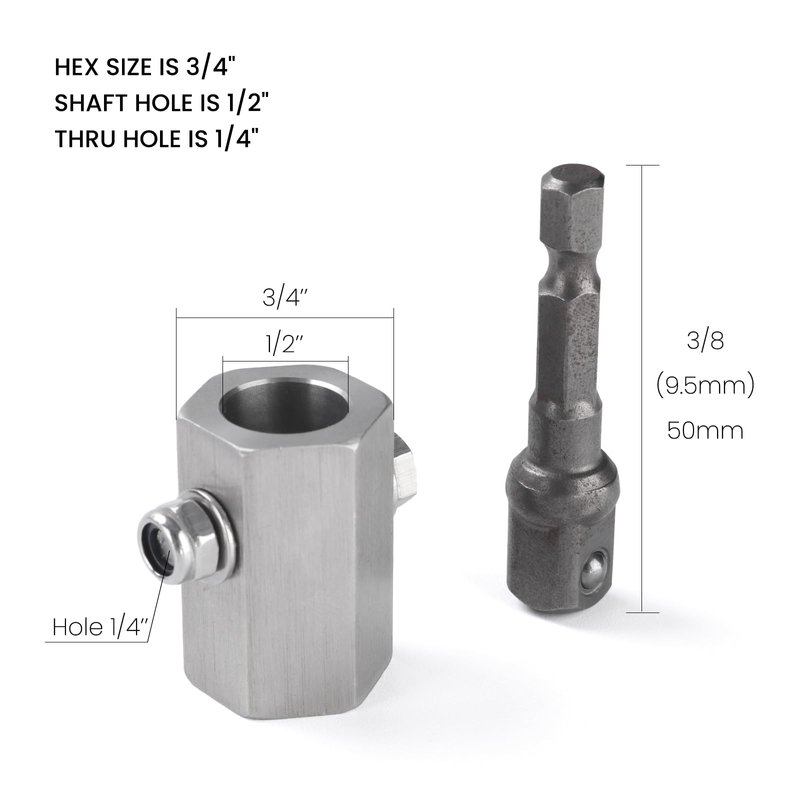 Hex size is 3/4", shaft hole is 1/2", and thru hole is 1/4".