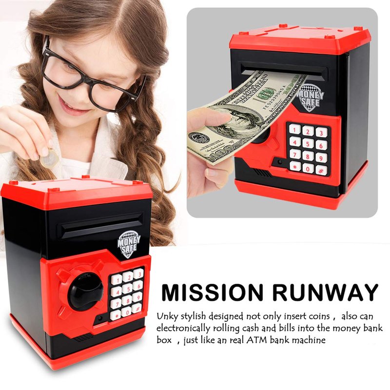 - 【Automatic Paper Money Scroll】- The premium money bank for kids has a unique function that allows you to roll the bills automatically into the machine, just like an ATM!