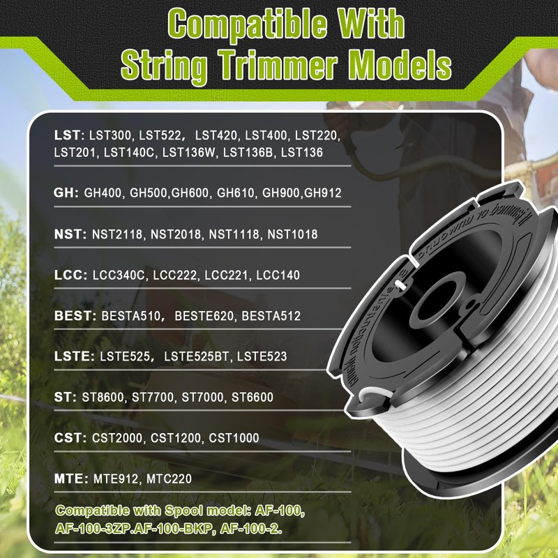 - AF-100 Spool Replace AF100, AF 100, AF-100-3ZP, AF-100-2, AF-100-BKP, AF-100-BKP 1, AFS 100. Compatible with multiple string trimmer models: GH900, GH912, GH600, GH610, GH400, GH500; NST2018, NST2118, NST1118, NST1018, NST1024, NST1810; LST220, LST201, LST300, LST400, LST420, LST136, LST120, LST140, LST1018, LST522, LSTE523, LSTE525; ST6600, ST7000, ST7200, ST7700, ST7701, ST8600, ST9000; MTC220, MTE912; CST1000, CST1100, CST1200, CST2000; BESTA510, BESTA512, BESTE620.