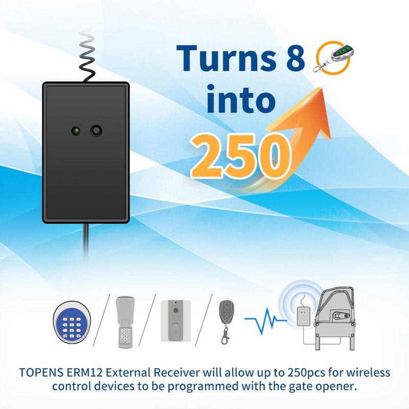 - Pair up to 250 Remotes - Simple wire connection makes installation labor-saving. Just connect the ERM12 to the gate opener system. Program the M12 Remote Control (incl.) with ERM12 universal receiver, and then the M12 remote will perfectly makes the gate operate between open-stop-close-stop-open. All TOPENS swing and sliding gate openers can be operated by the M12 remote. ERM12 rolling code external receiver can be programmed with up to 250 pcs TOPENS M12 remote control transmitters.