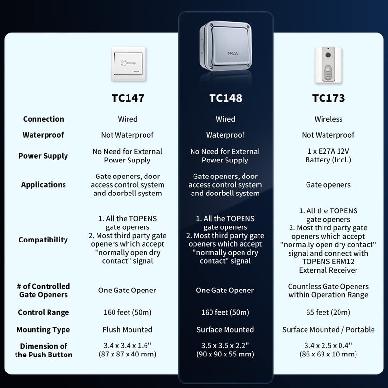 - Clever Design - TOPENS TC148 waterproof wired push button is a release switch designed for outdoor use, and commonly used at locations where the access control is essential. Weatherproof casing ensures the superior protection against water and dust from all directions. With automatic resettable design, the release button restores to its original state after your finger is removed. Simply press the button to start or stop the gate opener!