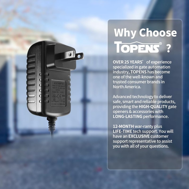 - WIDE APPLATIONS - The TS24-U voltage transformer can directly power 36VDC devices, such as LED strip lights, vacuum cleaners and other DIY tools. In addition, this adapter is ideal for charging 24VDC batteries to power TOPENS A & AD series swing gate openers. It is recommended to use where AC electricity is accessible, but not stable. Simply connect the TS24-U power converter to the control board and plug it into an outlet.