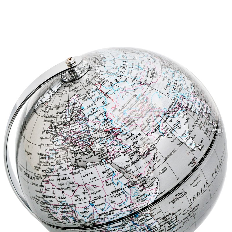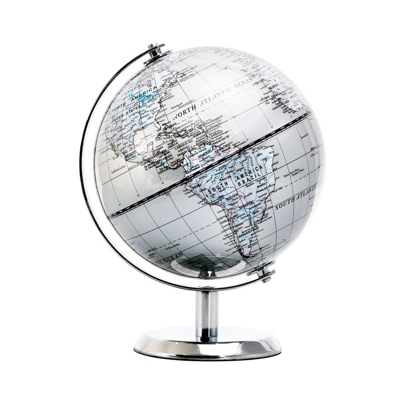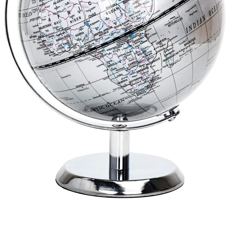 Topglobe 5.5'' World Globe Silver - English Map - Mini Globe Educational/Geographic - Stainless Steel Arc and Base - Silver Grey