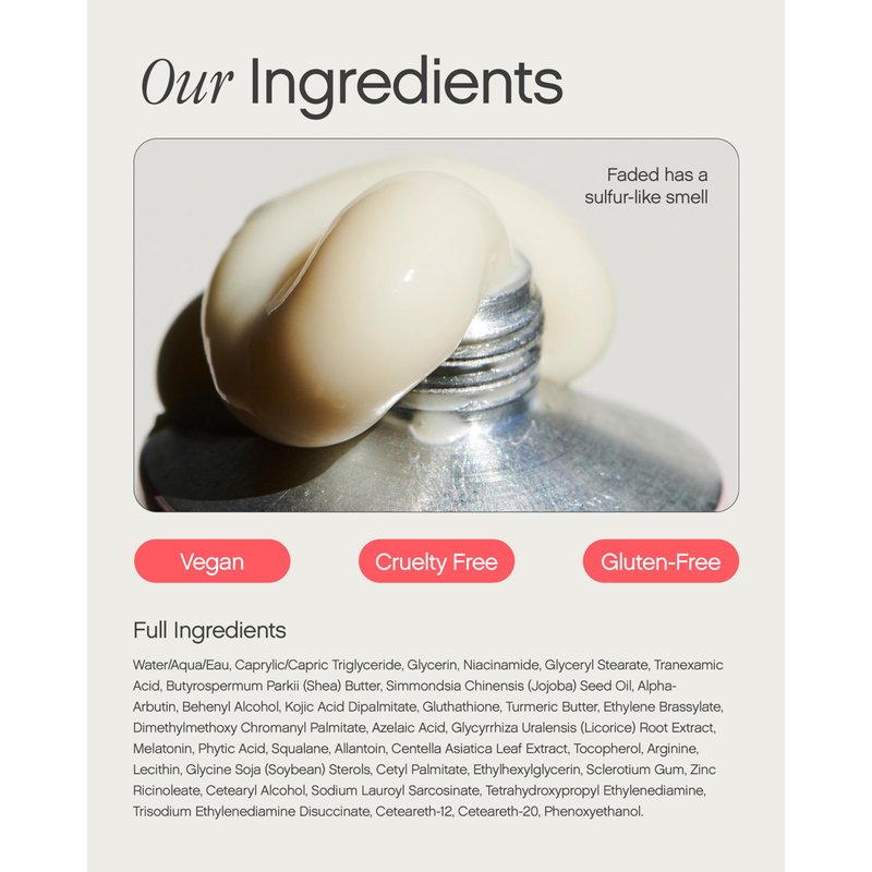 Dark circles, sun damage and pigmented skin? Get Faded Under Eye Masks + Faded Serum – a starter pack to experience our best-selling Faded formula for brightening and evening skin tone. Faded Eye Masks harness the same skin-brightening and evening ingredients you love from Faded Serum to reduce the look of discoloration from dark circles, with added caffeine and a hydrogel formula to soothe, depuff, and hydrate the extra-sensitive skin under your eyes. Patch test prior to use is advised.