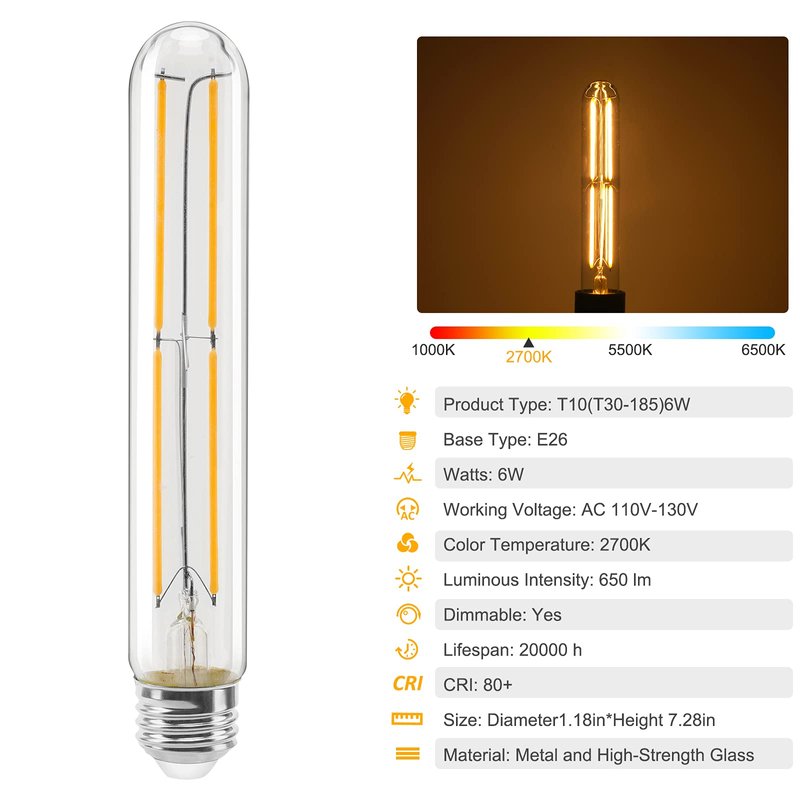 TopLeder E26 LED Bulb 60 Watt Tubular, Soft White 2700k Edison Bulb 6 Pack, 6W 650LM, Dimmable T10 Led Bulb, E26 Medium Base, 7.28 Inch Long Light Bulbs for Pendant Lights, Lamps, Outdoor Light