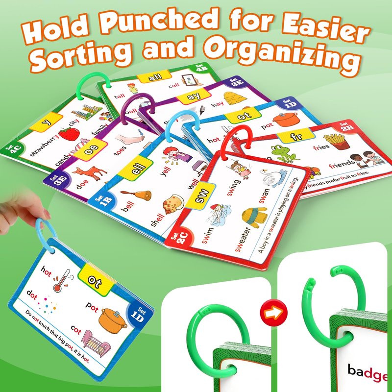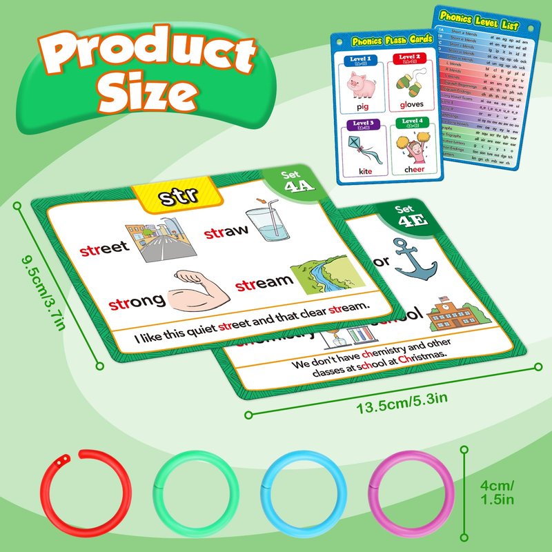 - 【What's Included】Include 62 double-sided phonics flash cards, and 4 colored rings for easy classification. Covering up to 80% of vocabulary found in beginner books, there are a total of 480 words, 120 Phonics, 480 Pictures, 120 Sentences, 20 Phonic Group Sets (1A-5E)