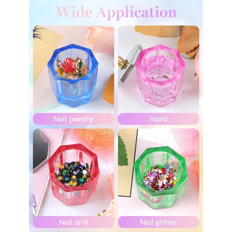 - 【Package Included】You will get 4pcs crystal glass nail art dappen dish in color red, blue, green and pink, each one of them comes with stainless steel lid. Enough quantity to meet your different needs when doing nail design, and the different color also can help distinguish the different product inside.