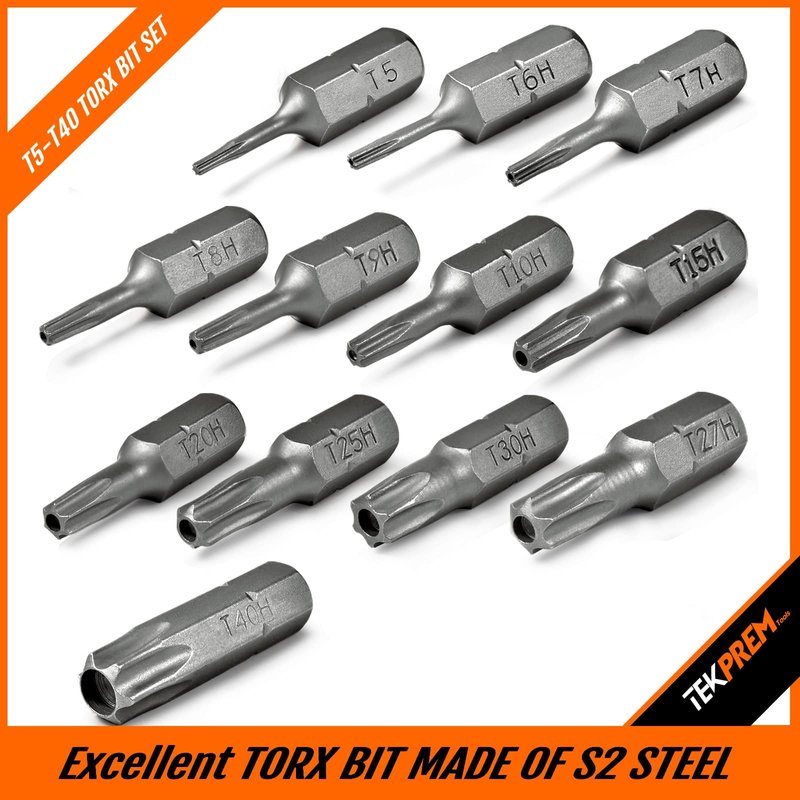 - [Security Torx Screwdriver Bit Set]: TEKPREM 12-piece torx bit set with driver handle include T5 normal torx bit and TR6 TR7 TR8 TR9 TR10 TR15 TR20 TR25 TR27 TR30 TR40 security torx bits set.