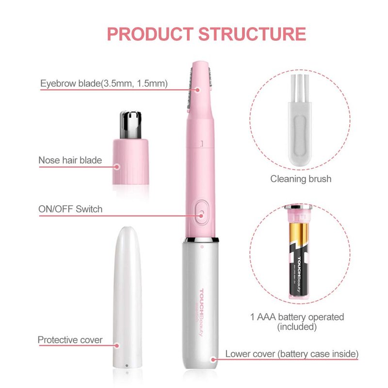TOUCHBeauty Ear Nose Hair Trimmer and Eyebrow Trimmer for Women 2in1 Facial Hair Removal set with Dual Trimmer Head Battery Operated Battery Included Product Key Selling Points * Double blade head * Eyebrow Hair Trimming * Nose and ear Hair Trimming * Shapes eyebrows * Portable & lightweight device * Eyebrows Place the Blade on the area of the eyebrow you want to trim and move the blade. * Nose and ears hair Slowly and slightly insert the nose/ear trimmer blade into the nose or ear to trim (do not insert it too deep to avoid injury). downwards to achieve a perfect shape. Trim under the eyebrows from outside to inside. * Forehead Move the Blade from the hairline to the center of the forehead and back to the airline. * Cheeks Move the Blade from the center of the face to the ear. * Upper lip Stretch your upper lip and trim downwards. * Sideburns Decide on the length of the sideburns and trim downwards. * Neck Hold the skin with your fingers and move the Blade upwards.