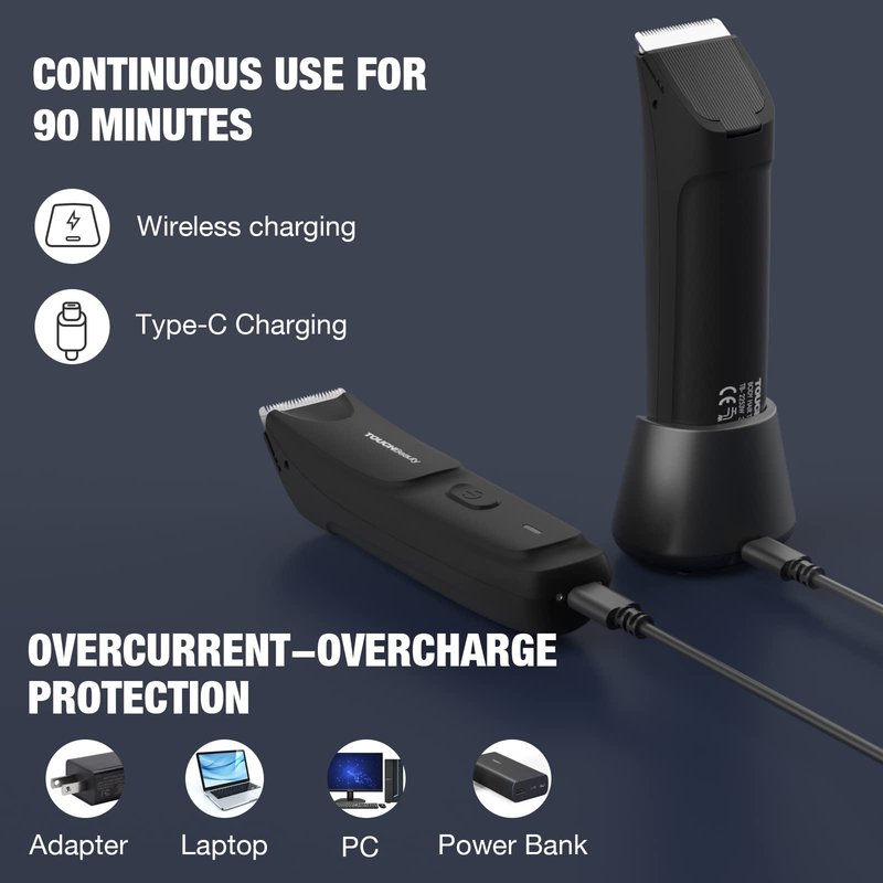 - 【Newly upgraded wireless charger base】For your more convenient use of this body hair groomer, we have specially upgraded two charging methods, wireless and Type-C. You can even charge the Groin Hair Trimmer with a computer, laptop or power bank. After fully charged can it be used continuously for 2 Hours, which completely solves the annoyance of repeated charging of old-fashioned body hair trimmers.