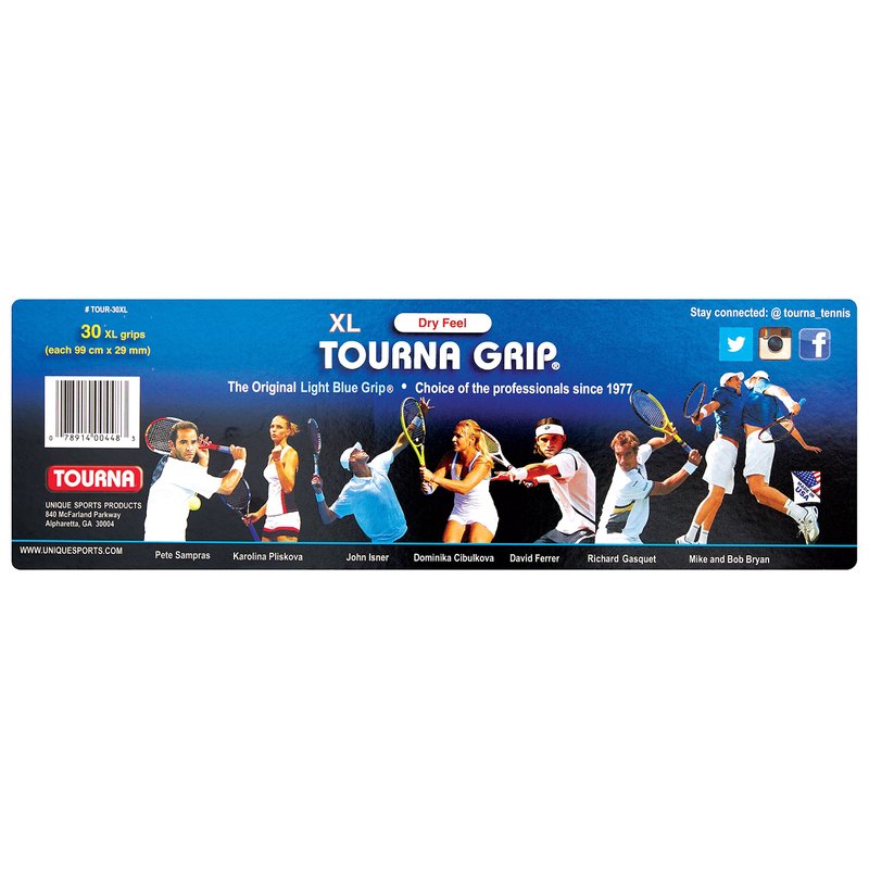 • 30 XL GRIPS PER PACK in a vinyl zipper pouch to keep grips organized and secure in your tennis bag. Includes a large roll of finishing tape. The Tourna-Grip Light Blue Color is a Federally Registered Trademark. You can identify Tourna Grip by its famous blue color on TV, magazines, or on the court next to you! Tourna Grip is also the only tennis overgrip MADE IN THE USA!!!